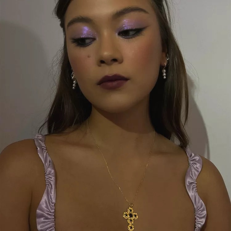 برای پلکها، میتوانید از سایه ماریو رنگ party glam استفاده کنید و برای برجستهتر کردن درخشش آن میتوانید کمی تاپ گلاس براق روی آن بزنید.