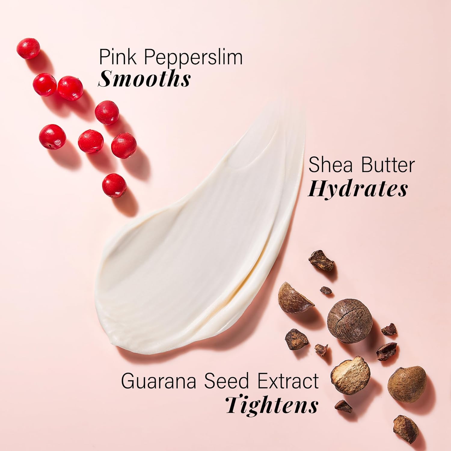 این بالم حاوی ترکیبات فعالی مانند عصاره دانه گوارانا و پینک پپر اسلیم است که به سفت شدن و آبرسانی پوست کمک میکند.