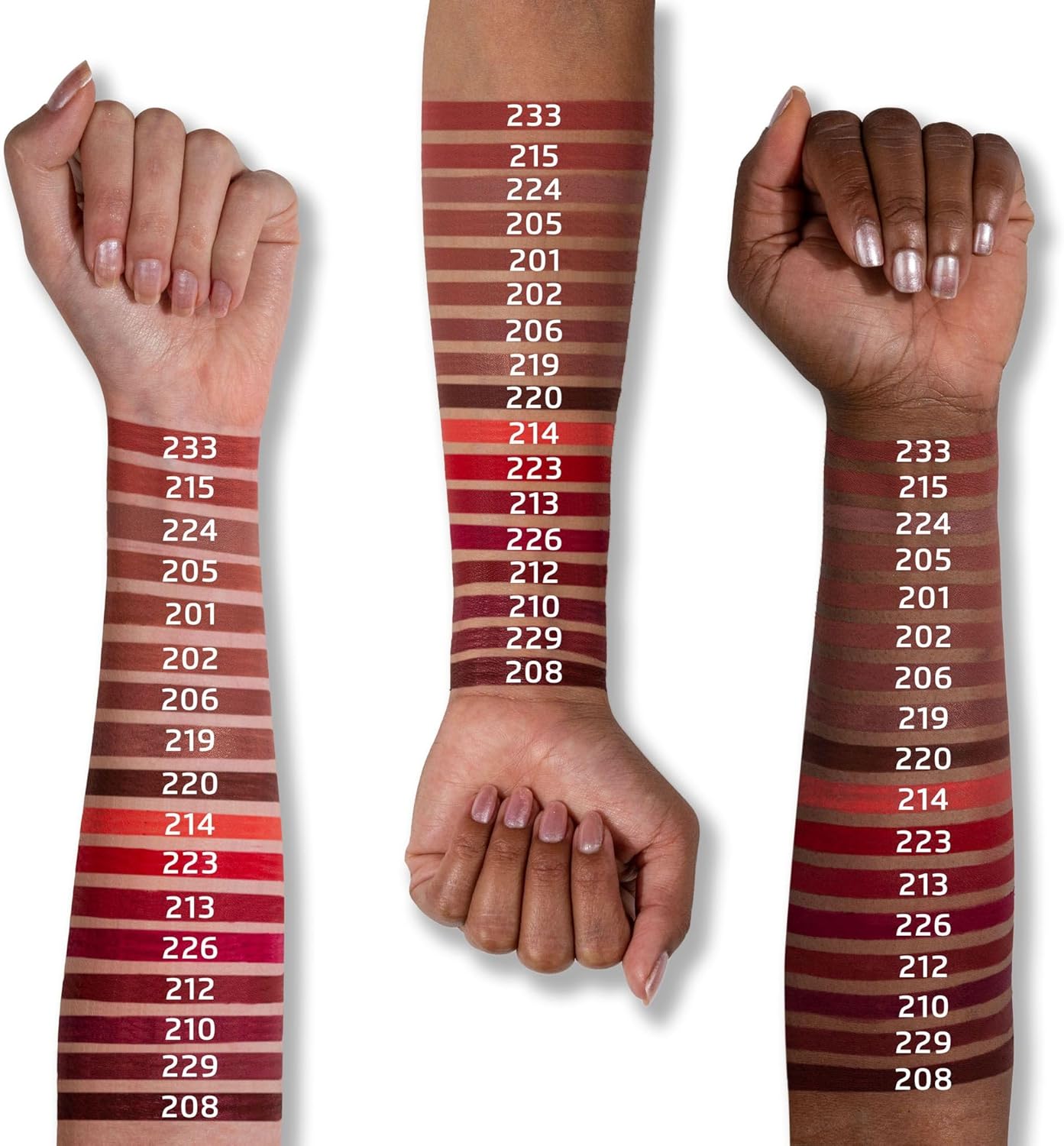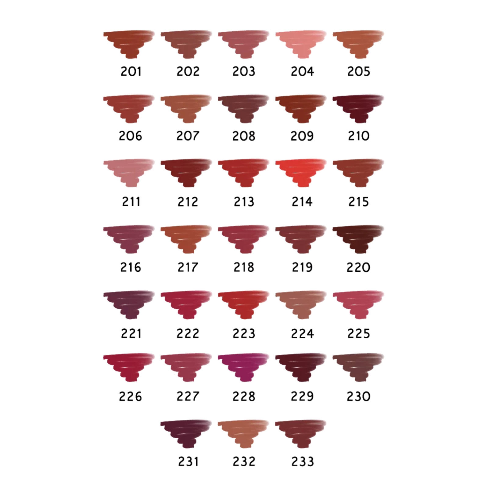 رنگهای متنوع: در طیف گستردهای از رنگها، از جمله رنگهای گرم و طبیعی مانند صورتی نود (224)، صورتی مات (225)، قهوهای مایل به قرمز (229) و انگور سیاه مات (230) موجود است.