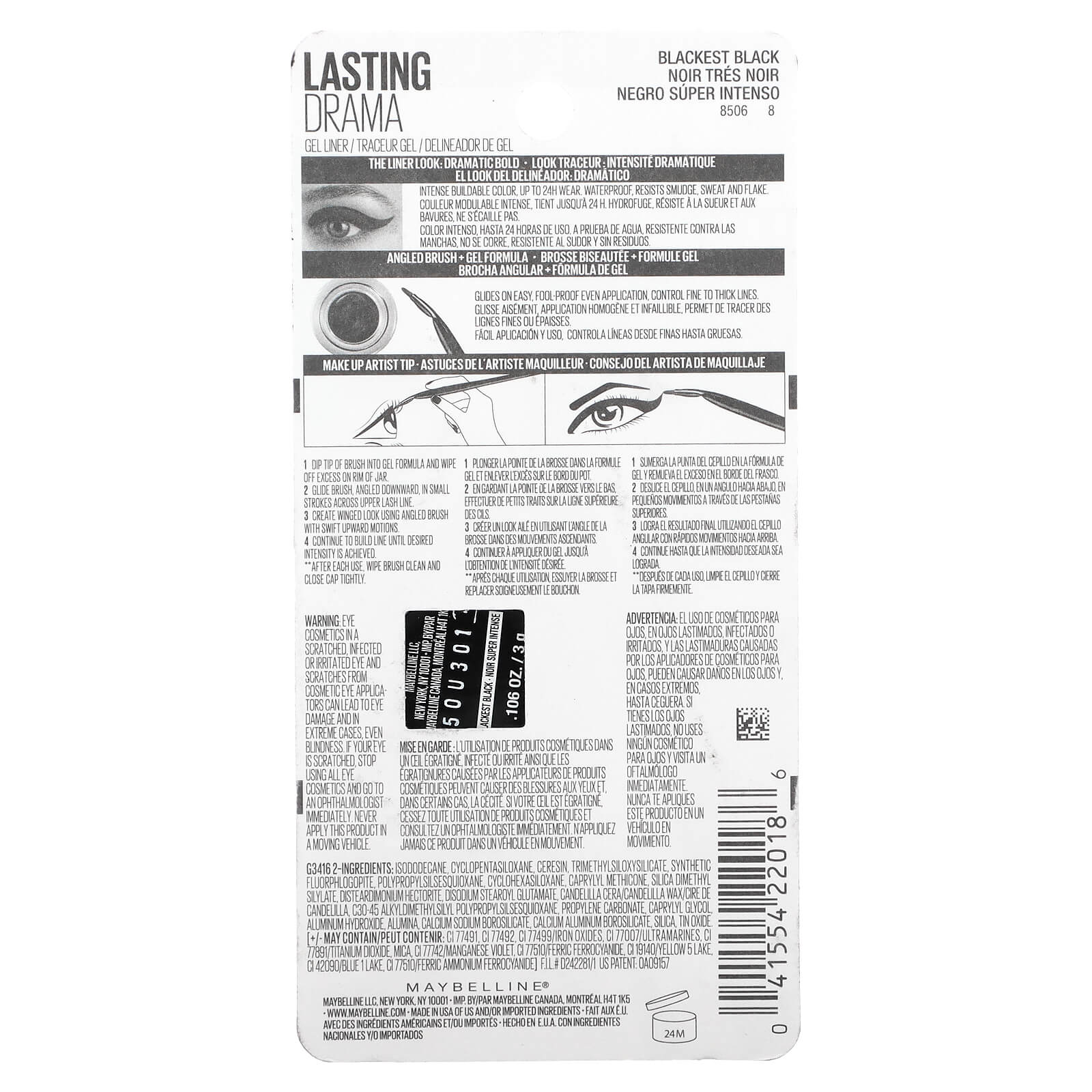 خط چشم 24 ساعته میبلین Lasting Drama 02 با بافت ژلی، ظاهری ماندگار و بدون لک برای شما ایجاد میکند. رنگدانه های بسیار غلیظ در یک پایه ژل شفاف