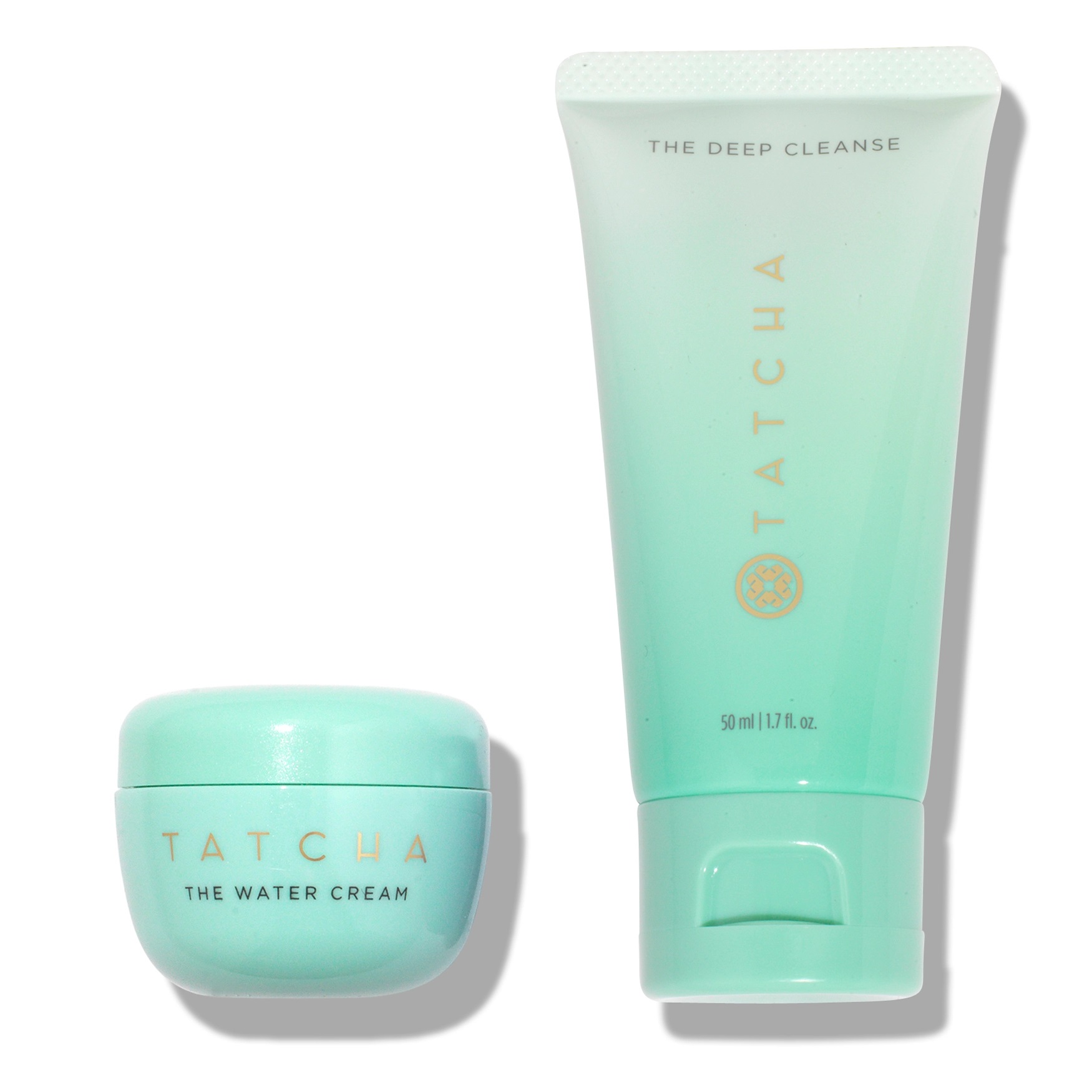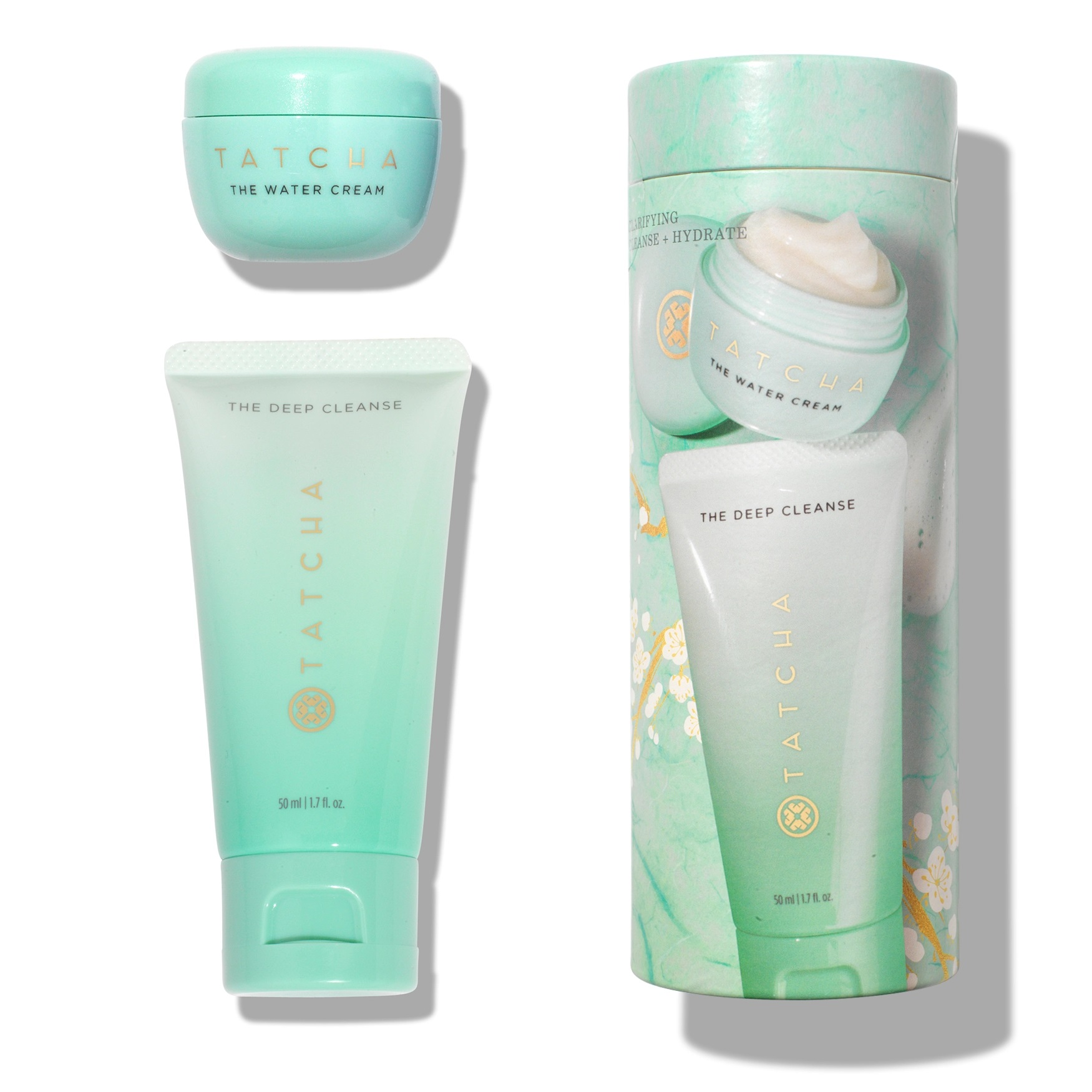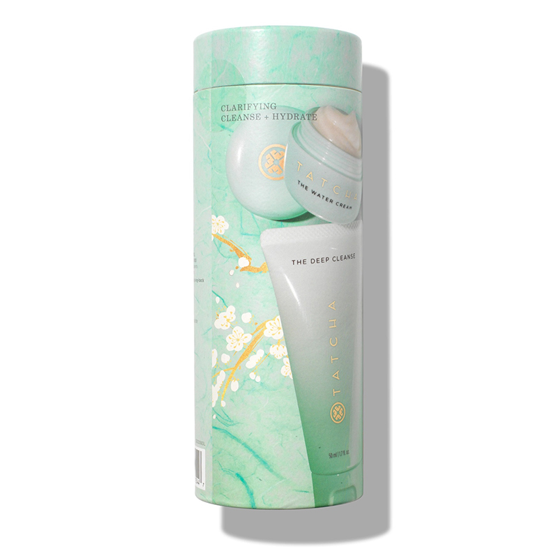 با استفاده از مجموعه مراقبت از پوست Tatcha Clarifying Cleanse + Hydrate که شامل یک پاک کننده لایه بردار عمیق و ملایم از میوه لوفا و گل رز وحشی