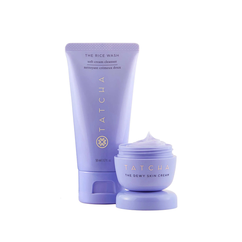 با استفاده از مجموعه مراقبت از پوست Tatcha Dewy Cleanse + Hydrate که شامل یک پاک کننده(نرم کننده) پوست و یک مرطوب کننده حجم دهنده است،