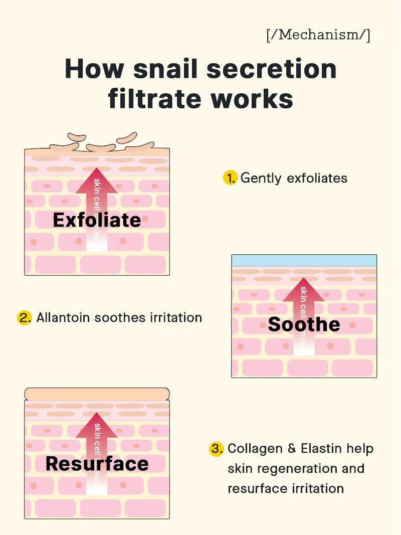 - بهبود بافت پوست: فیلتر ترشحات حلزون به بهبود بافت پوست و کاهش خطوط ریز و لکههای تیره کمک میکند.
