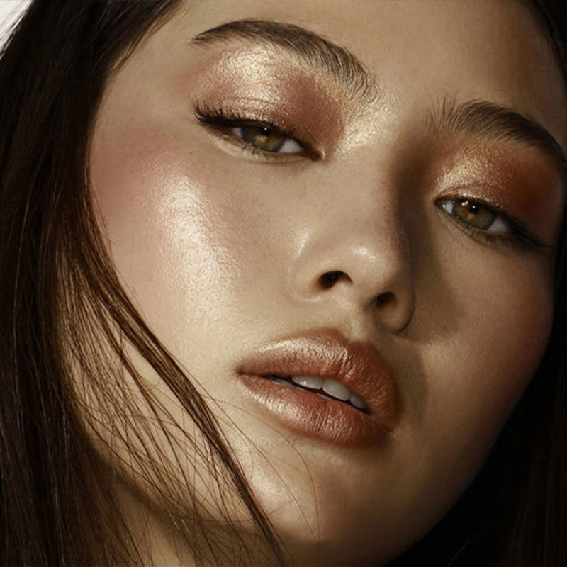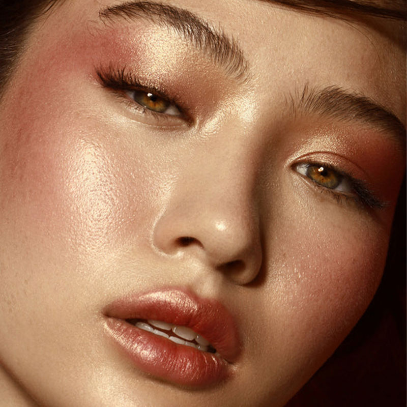 - هایلایتر پودری دوگانه: برای ایجاد درخشش چندبعدی روی خطوط گونهها با استفاده از انگشتان یا برس هایلایتر.