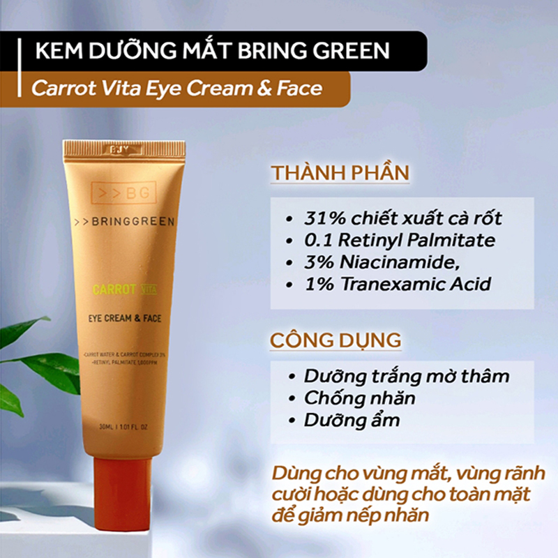 همونطور که از اسمش معلوم در کرم دور چشم هویج برینگ گرین از عصاره خالص هویج استفاده شده و علاوهبر اون ویتامین A، ویتامین B ، ویتامین C و ویتامین E هم در ترکیباتش وجود دارد.